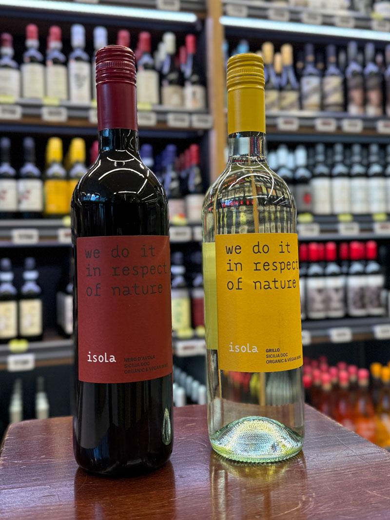 Isola økologiske vine   Nero D'Avola: Fyldig og fløjlsblød med aroma af modne kirsebær og en snert af lakrids. God til lettere kødretter eller ost.   Grillo: Frisk og frugtig med noter af citrus, honning og orangeblomst. Nyd den til grøntsagsretter eller fisk og skaldyr.